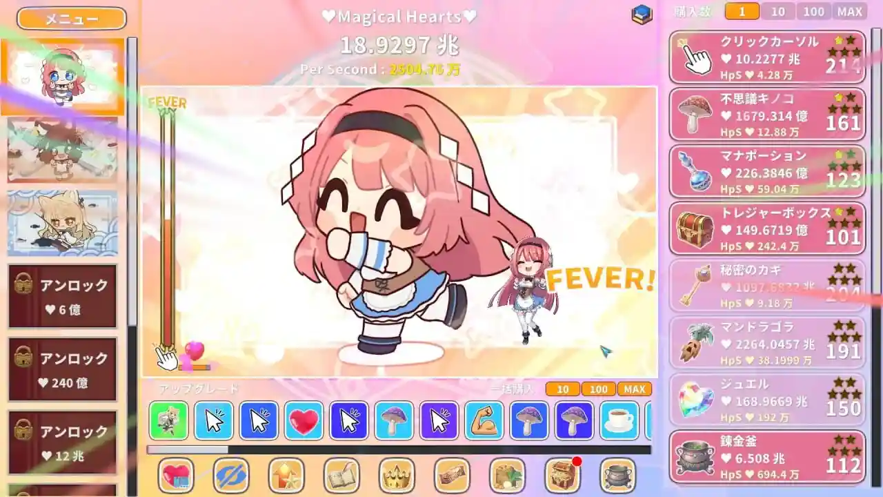 在游戏中,你的主要目标是通过点击来生成爱心,并利用收集到的爱心解锁各种神奇道具与生产系统。随着游戏进度推进,玩家可以开启多种狂热模式以及迷你游戏系统,使爱心的生产效率不断提升,从而快速积累资源并解锁更多内容。