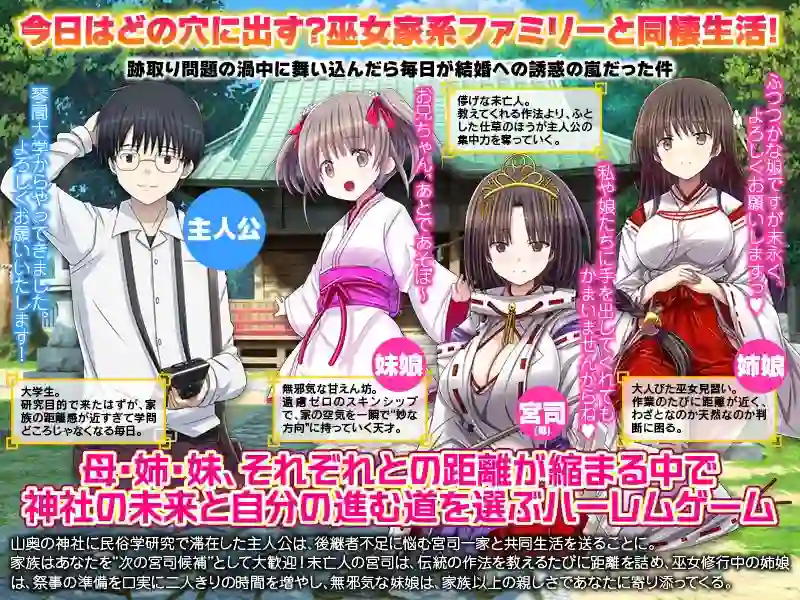 游戏以“寄居神社中全是巫女的家庭”为主要舞台,玩家将从一个因民俗学研究而来到神社的普通青年,逐渐卷入神社继承纷争及日常生活的风波中。随着时间流逝,与三位女性角色的关系日益加深,而这些关系将影响剧情的走向和结局走向。
